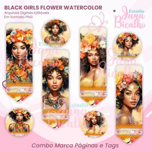 Combo Marca Páginas e Tag – Black Girls Flower Watercolor (Jana Bicalho)