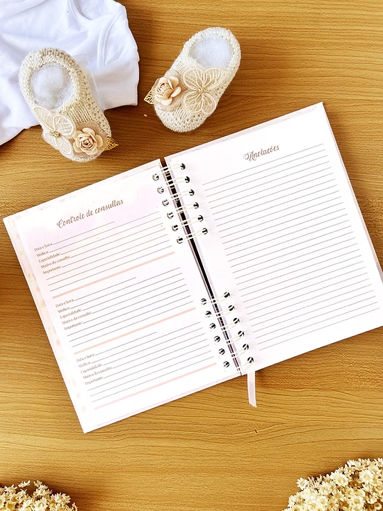 - Miolo: folha de rosto personalizada, controle de consultas e anotações (versão rosa e versão azul).