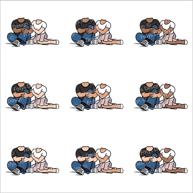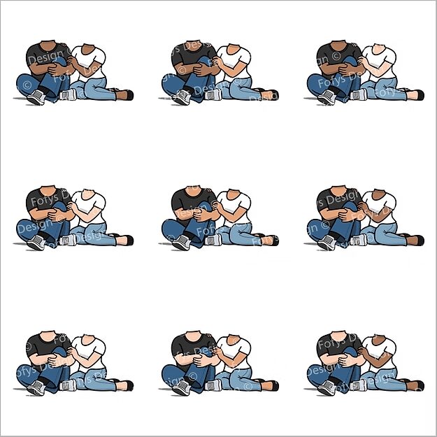 – 2 corpinhos de casal (sentadinhos) variando na mulher de calça e/ou saia em 3 tons de pele com 9 combinações