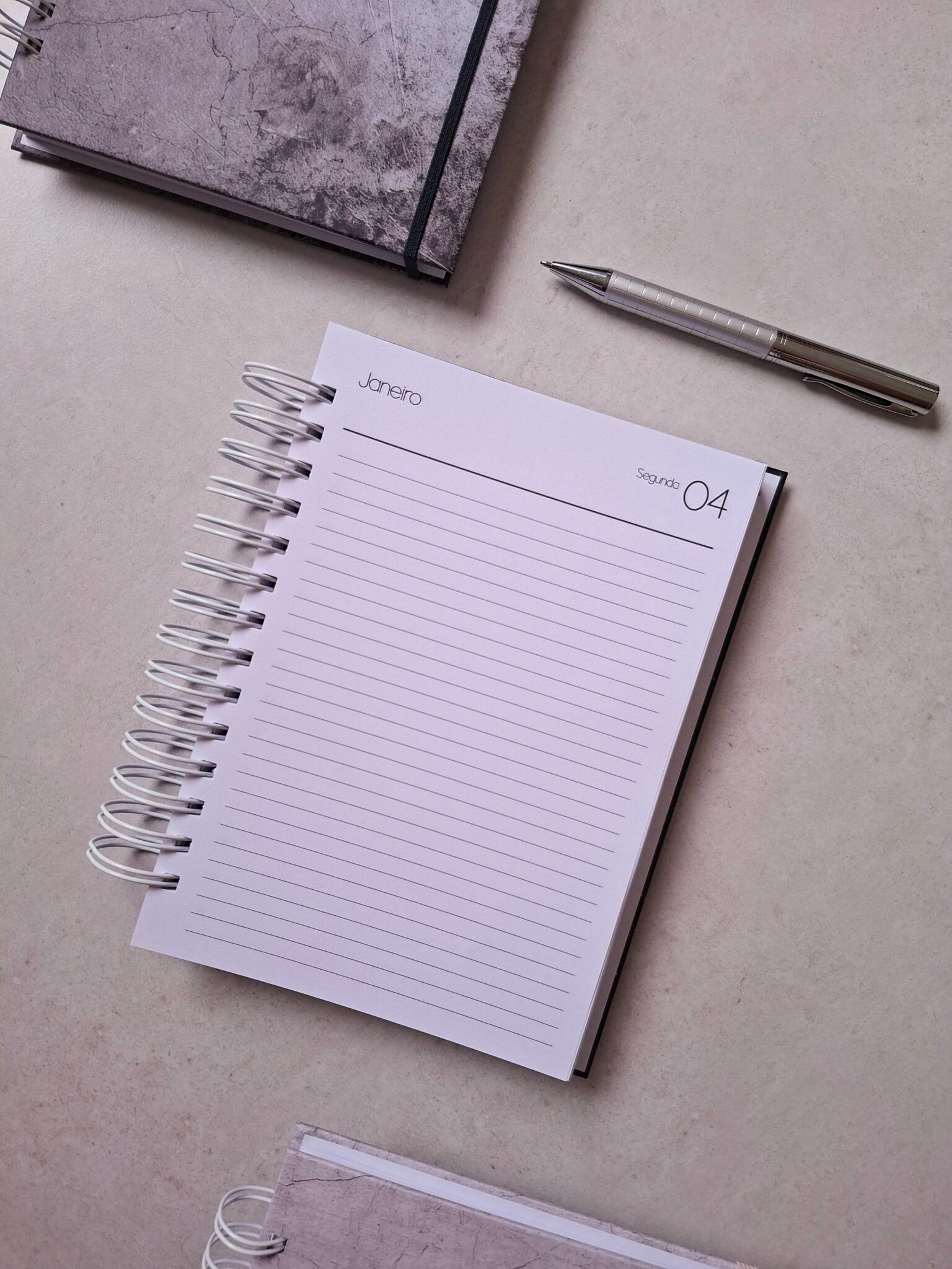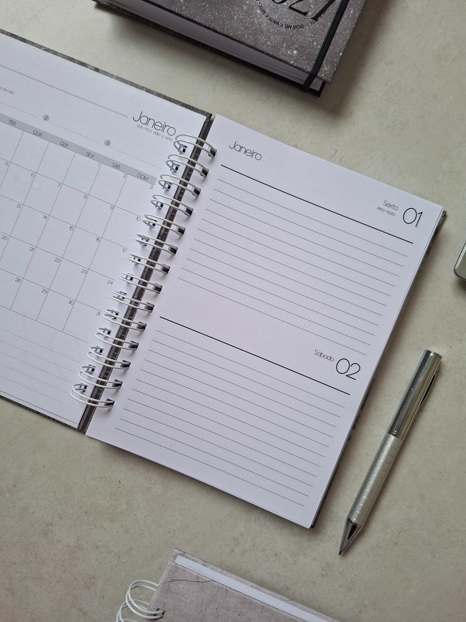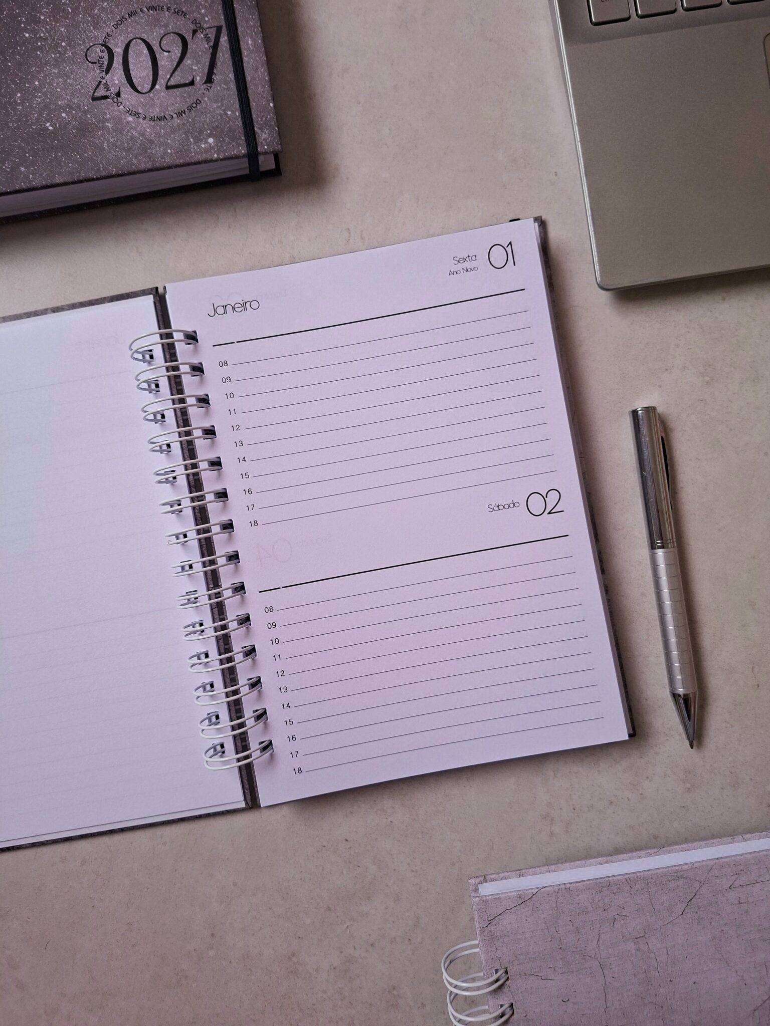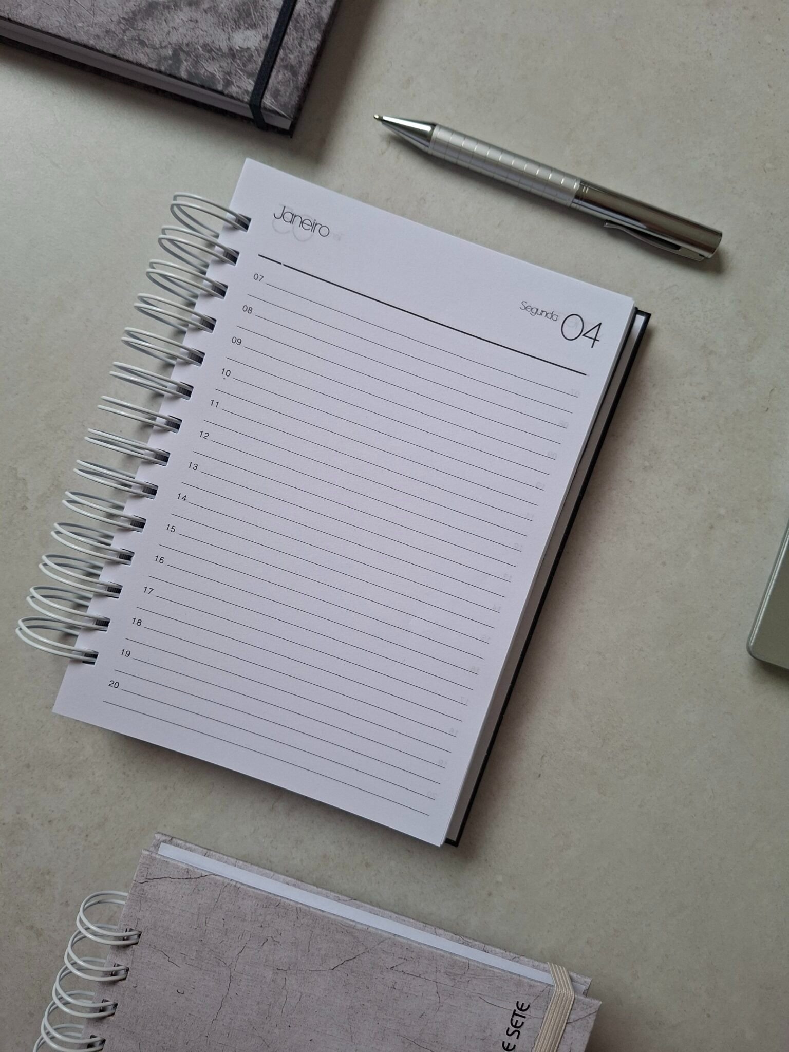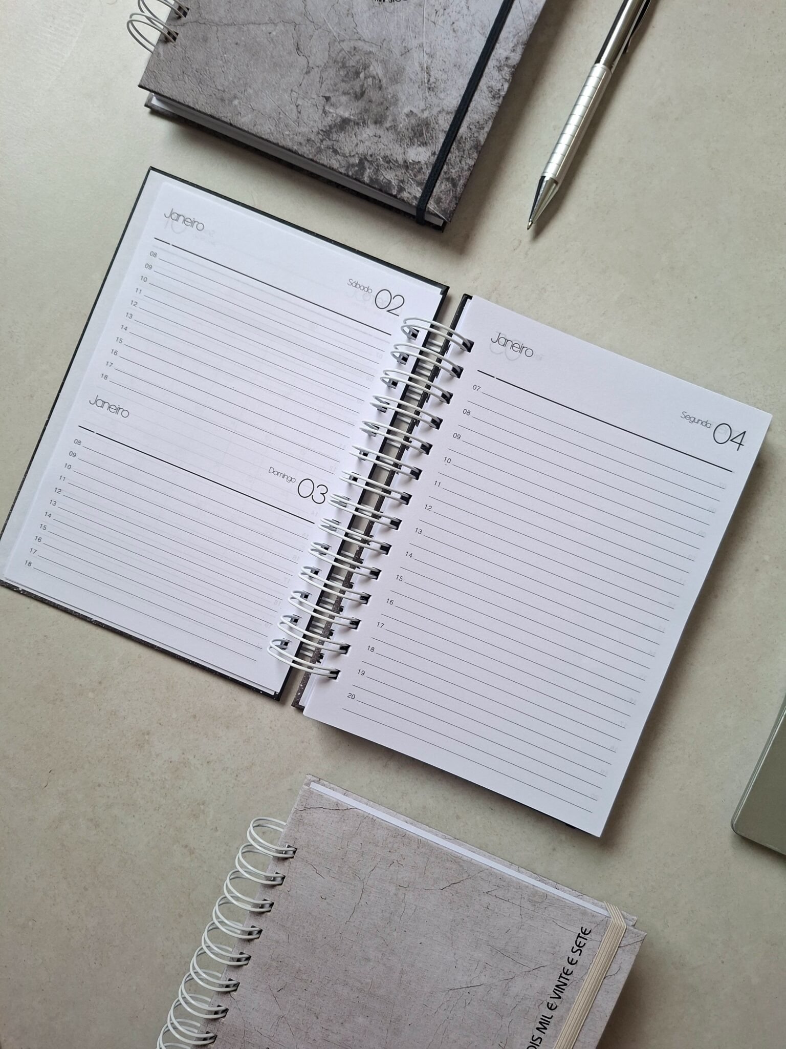 – Agenda 1 dia por página (sáb/dom na mesma página) com horário das 7 às 20h (segunda a sexta) e horário das 8às 18h (sáb. e dom) – 350 páginas