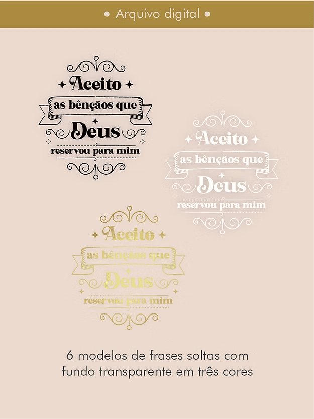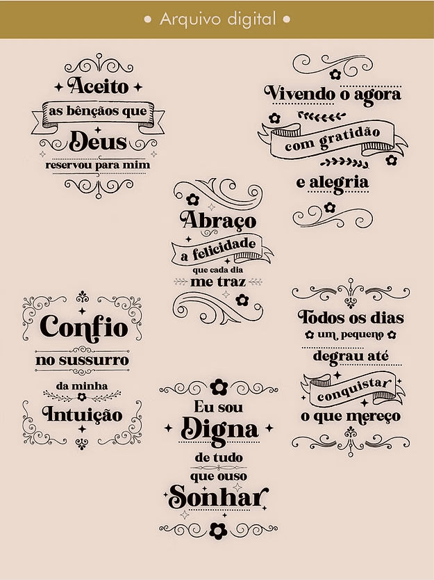 – 6 frases soltas com fundo transparente em 3 cores: preto, branco e dourado.