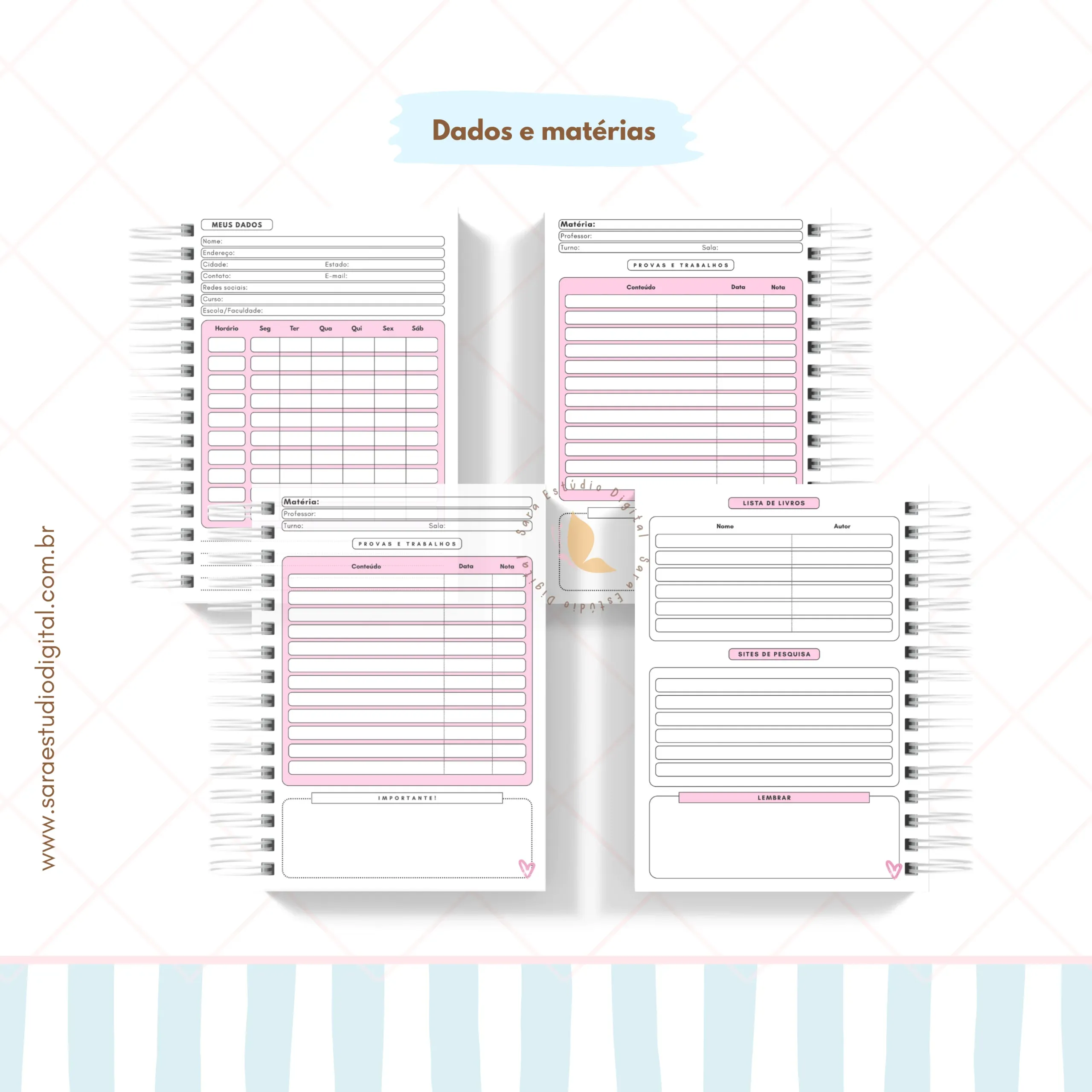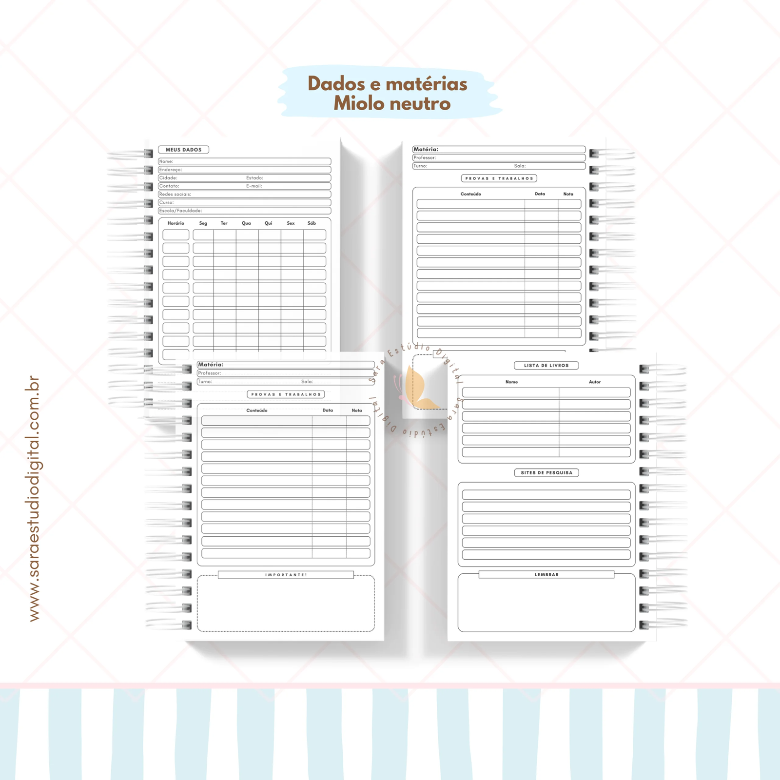 Incluso páginas de dados e matérias nos tamanhos: A5, Colegial e Universitário.
