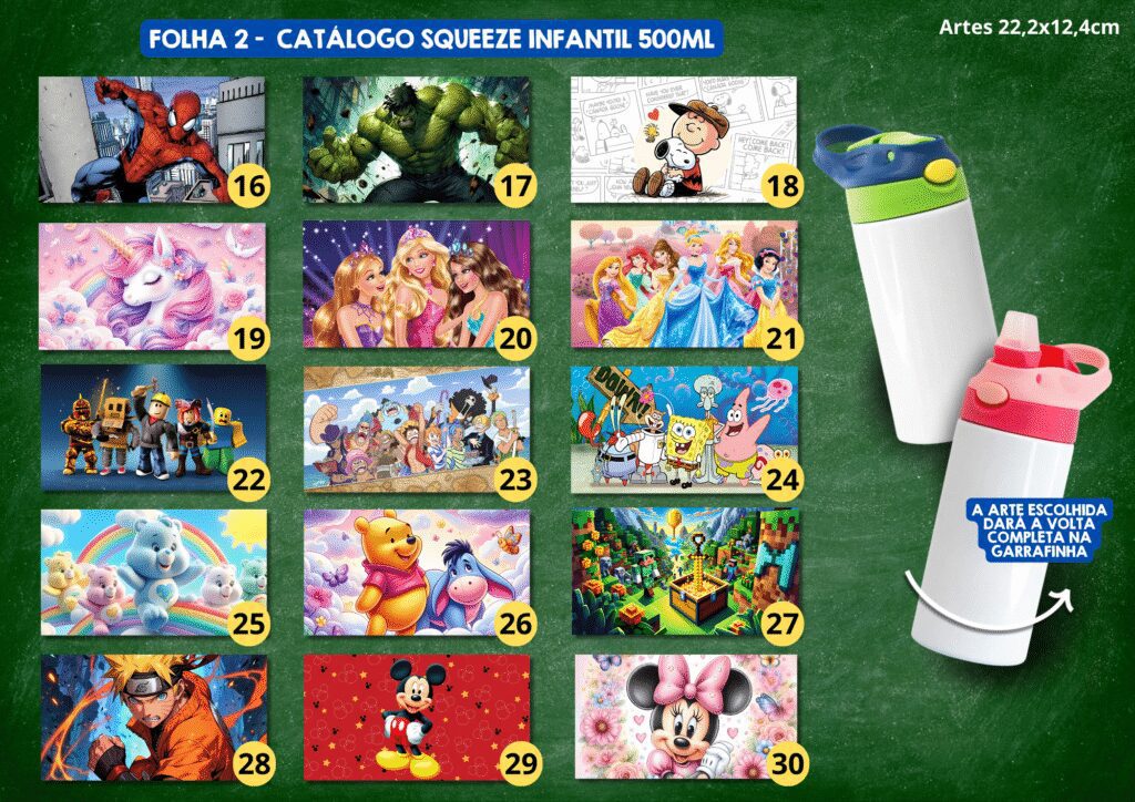 ARTES PARA SQUEEZES INFANTIS 500ML – (SALVO EM PNG) EM 36 TEMAS DIFERENTES (ARTE 22,5X12,4CM)