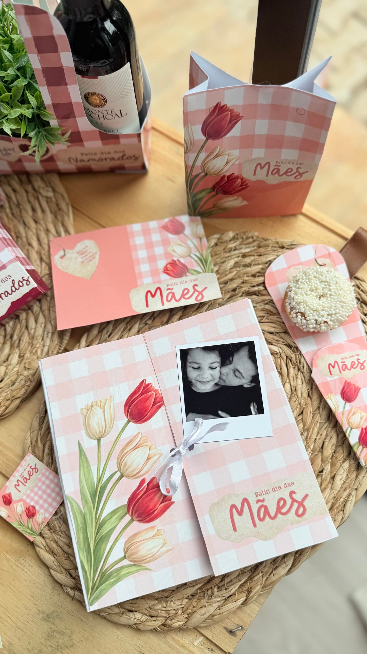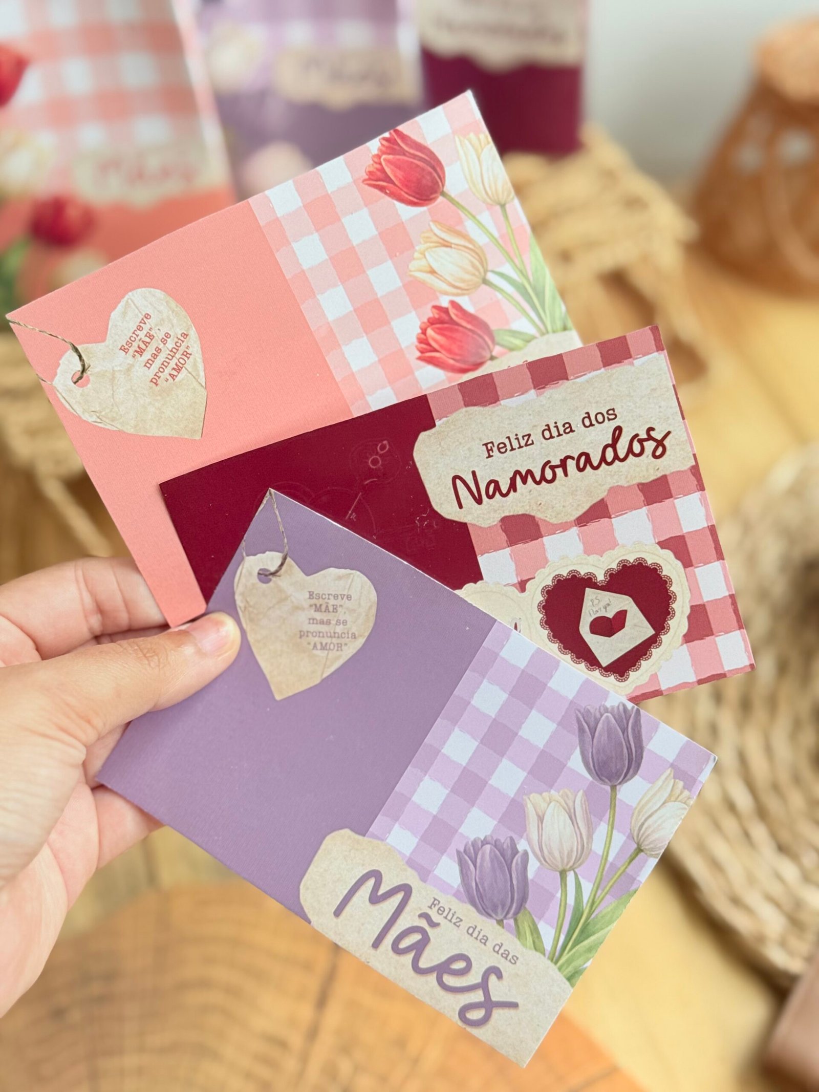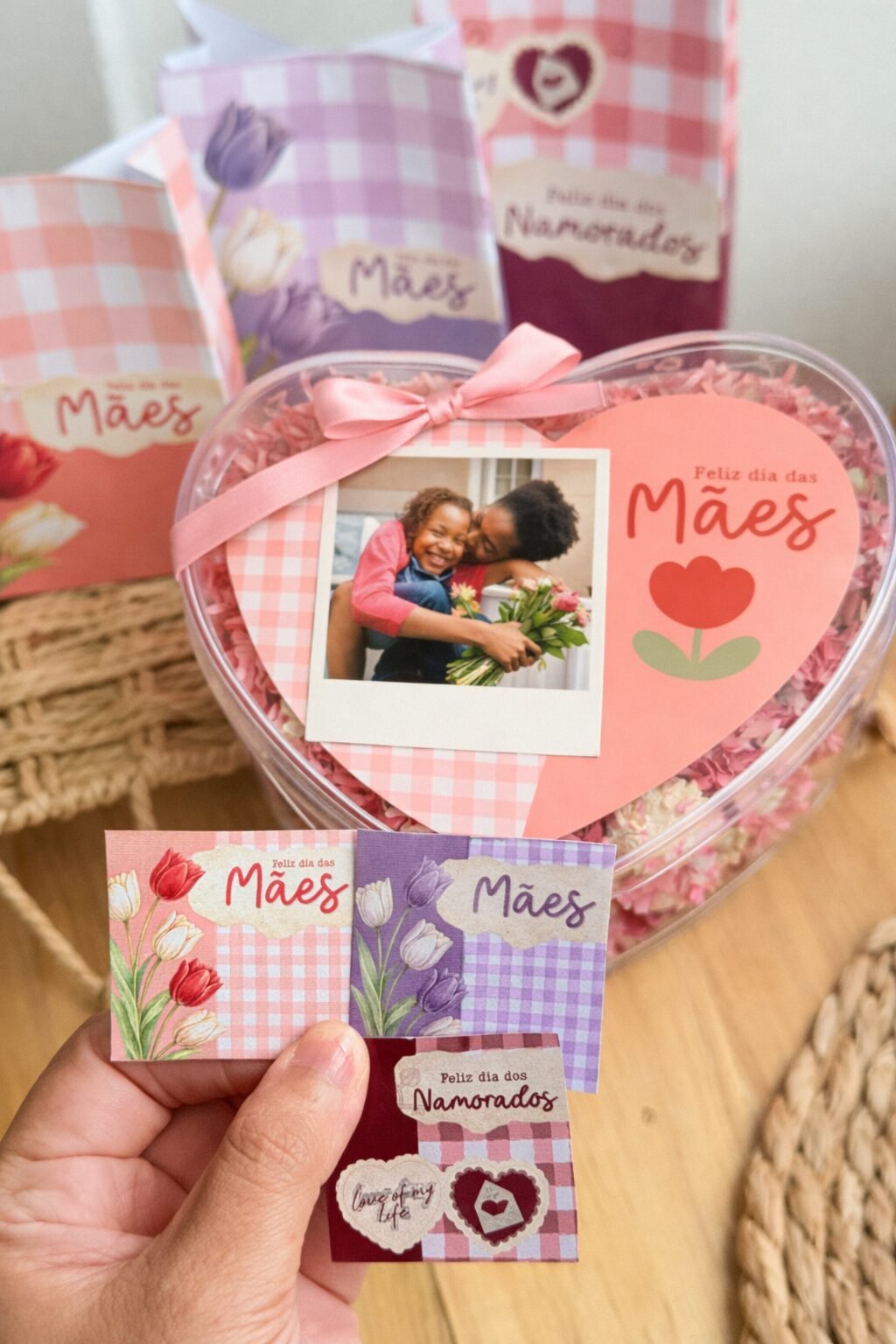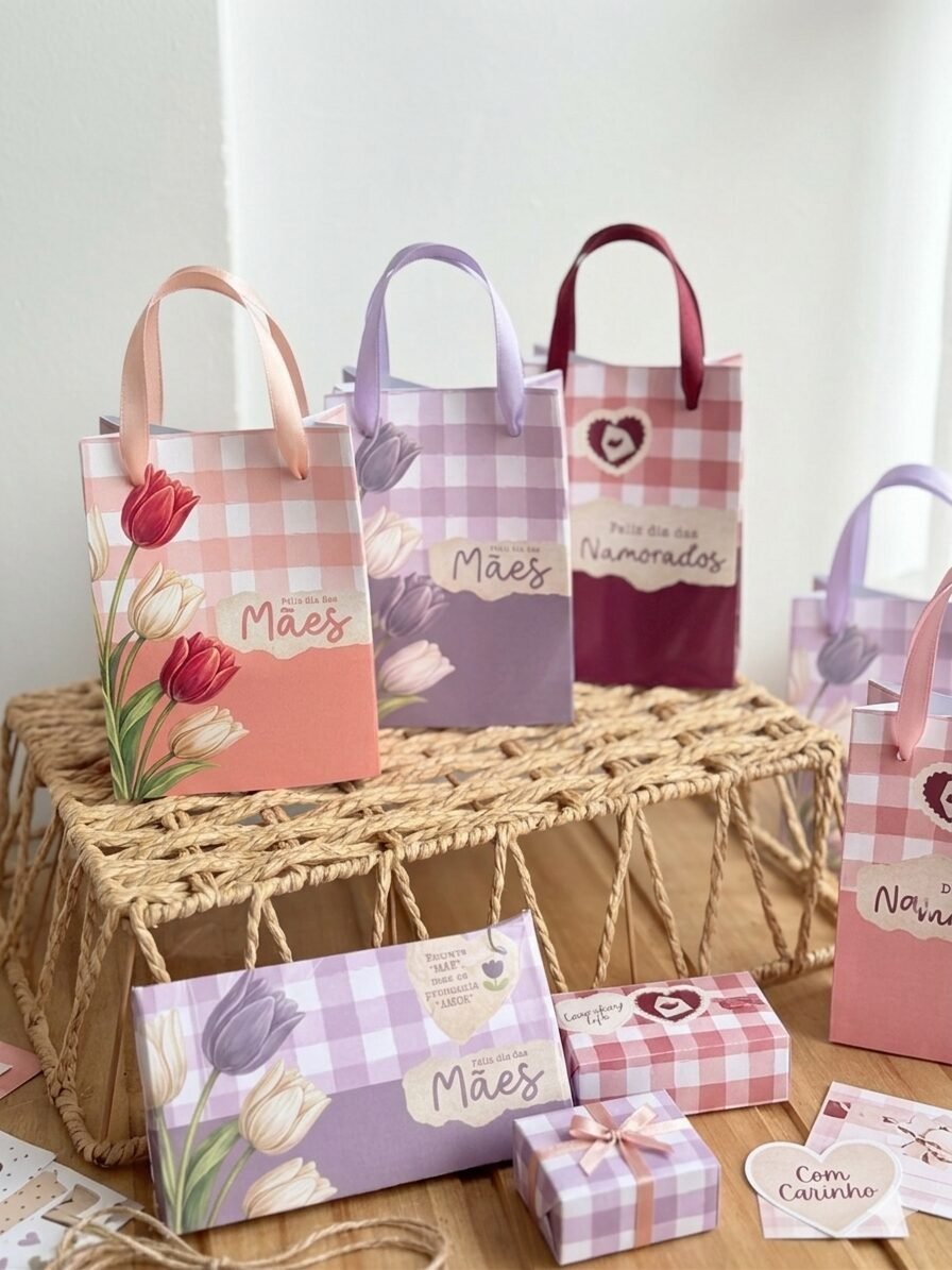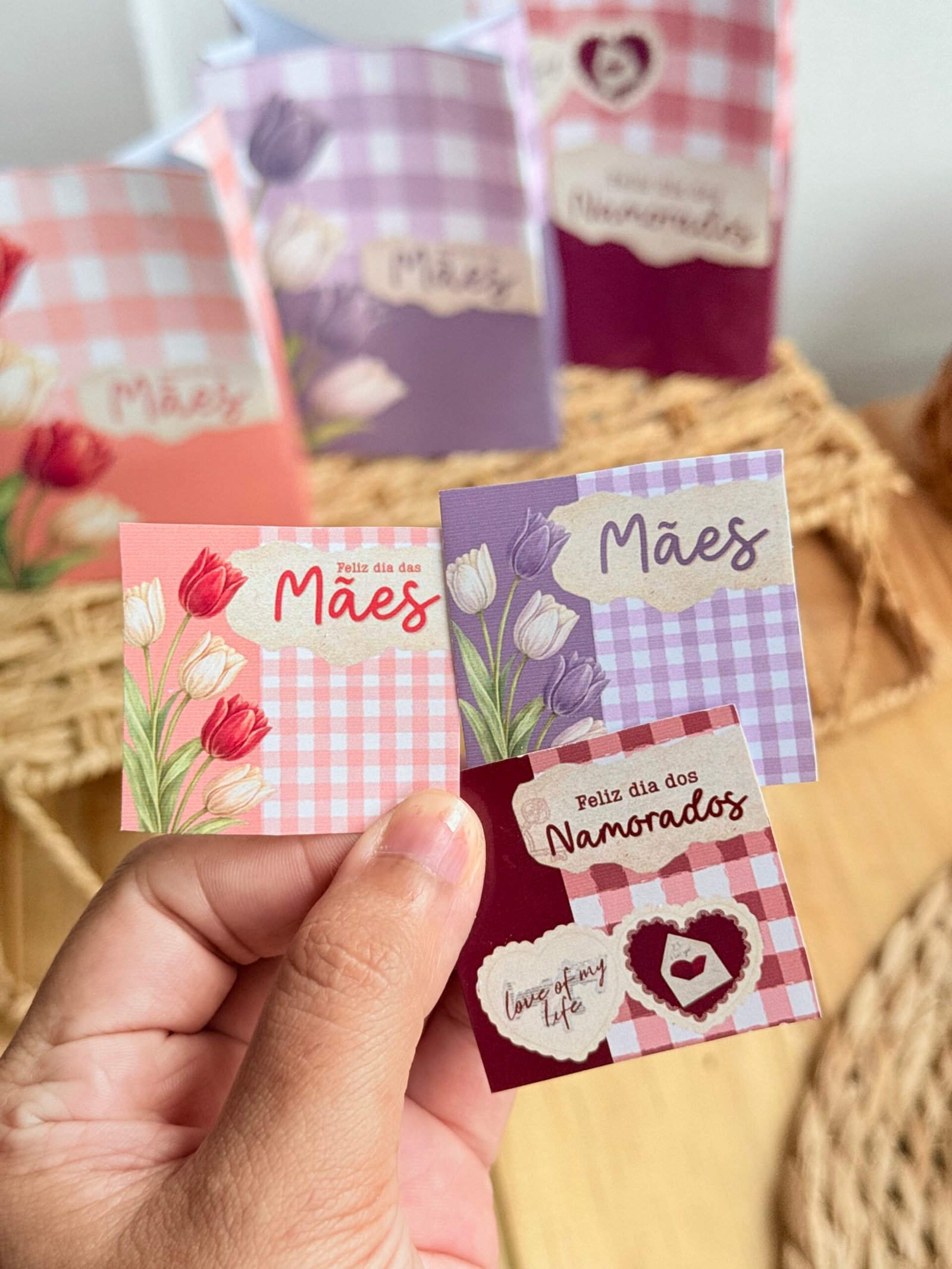 - Sacola P e M, cartões 14×9 e tags/adesivos