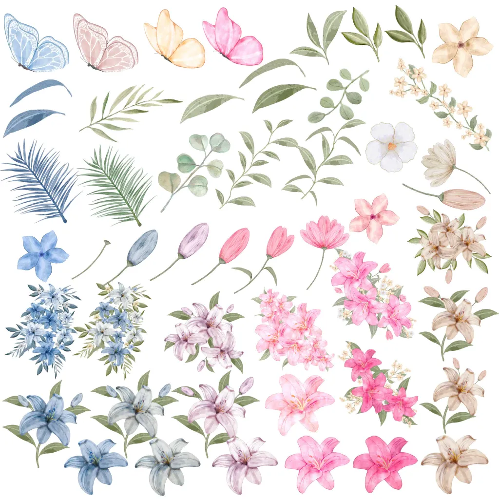 • 86 elementos em PNG – lírios e flores em aquarela individuais, além de brasões, faixas e laços decorativos elegantes.