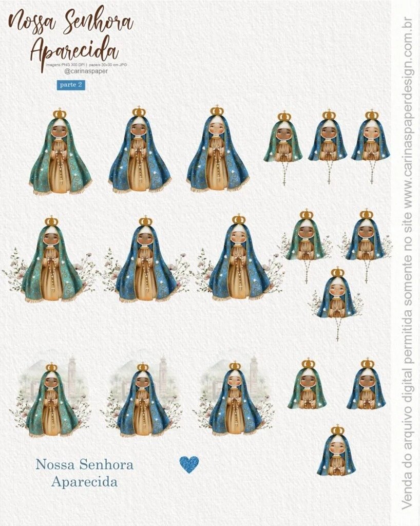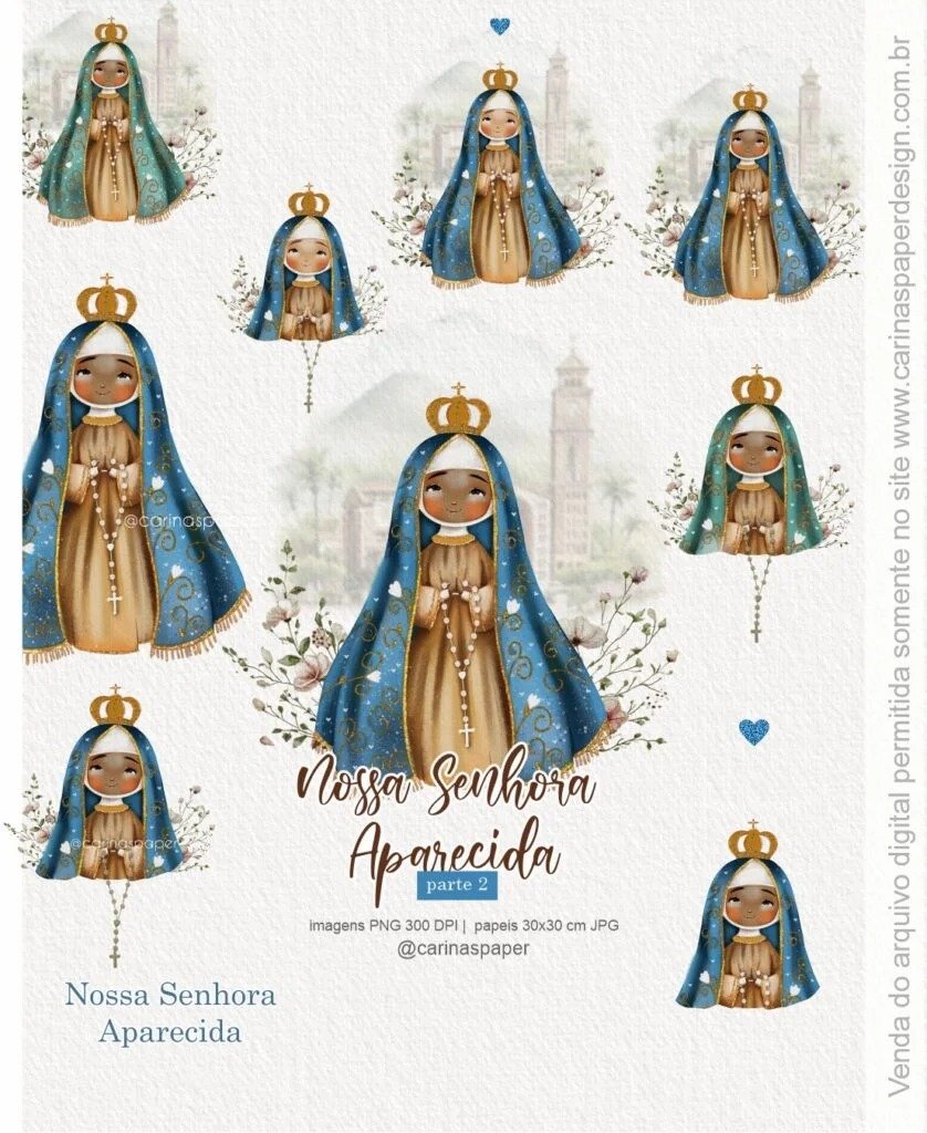 • Ilustrações exclusivas de Nossa Senhora Aparecida em estilo delicado e inspirador (formato PNG) com manto azul e pele mais escura e manto azul petróleo e pele mais escura com variações.
