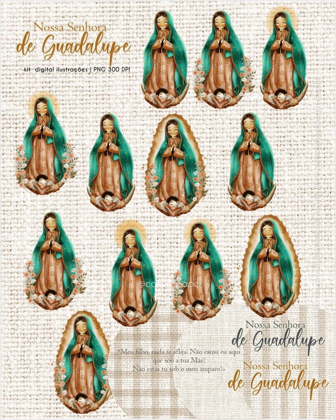 - Ilustrações lindas de Nossa Senhora de Guadalupe com olhos fechados e abertos da Carinas Paper para você criar projetos incriveis de evangelização aí em seu ateliê.