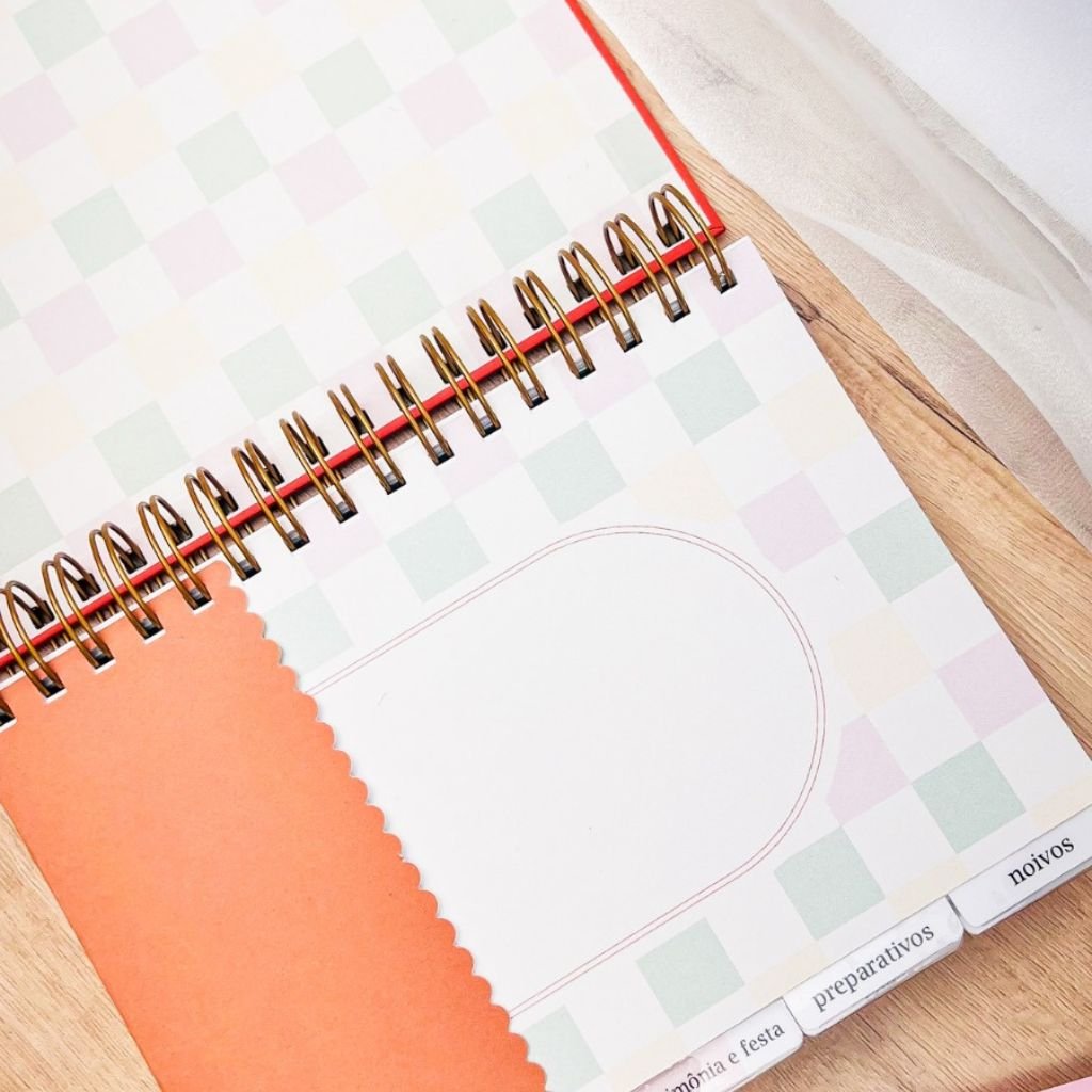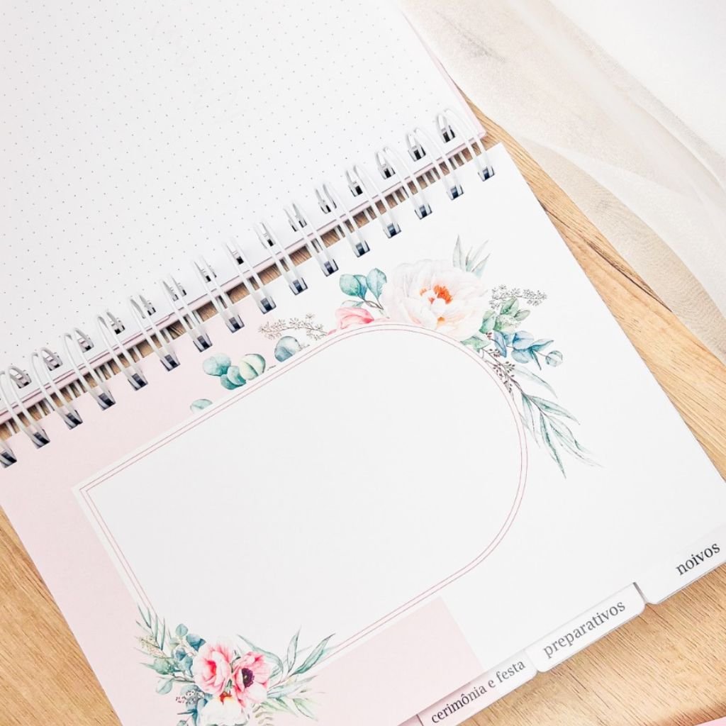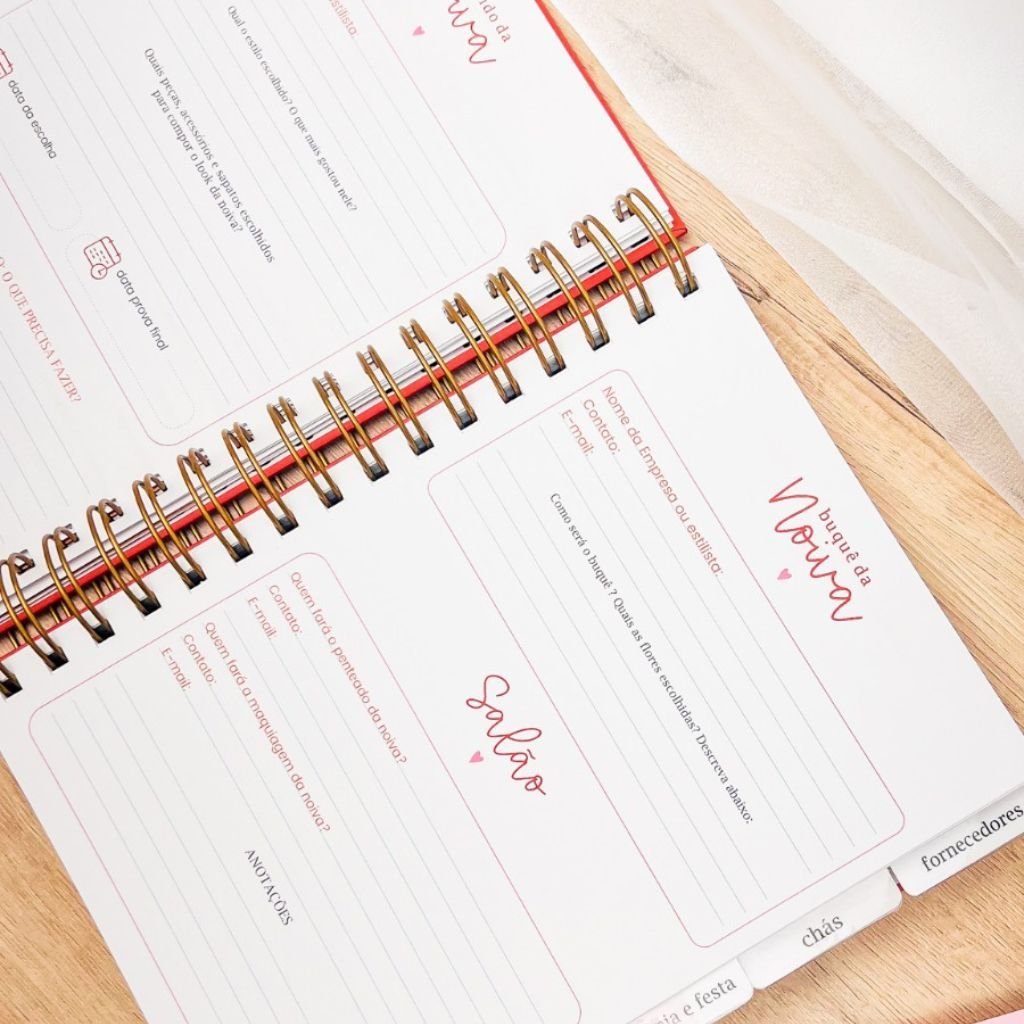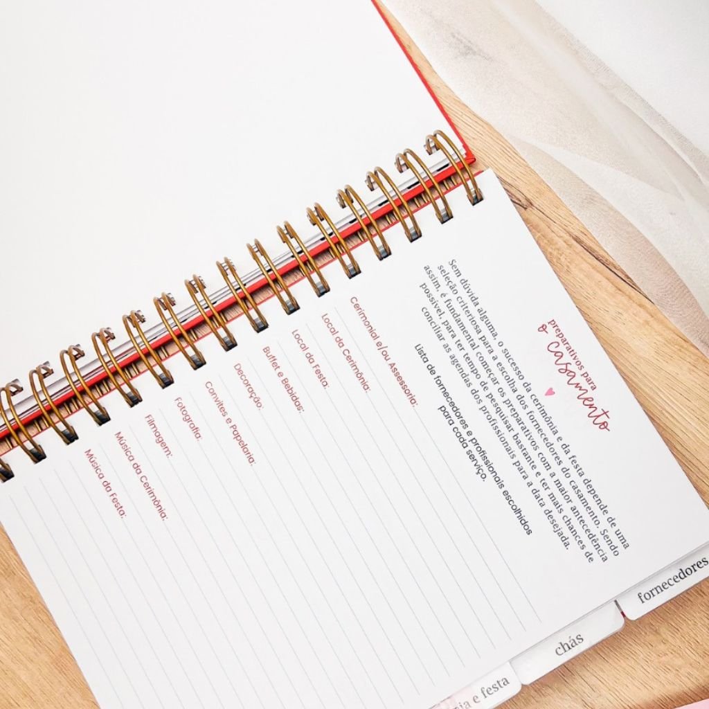 Divisórias: NOIVOS, PREPARATIVOS, CERIMÔNIA E FESTA, LEMBRANCINHAS, CONVIDADOS, FORNECEDORES, CHÁS, LUA DE MEL, CHECKLIST E ANOTAÇÕES.