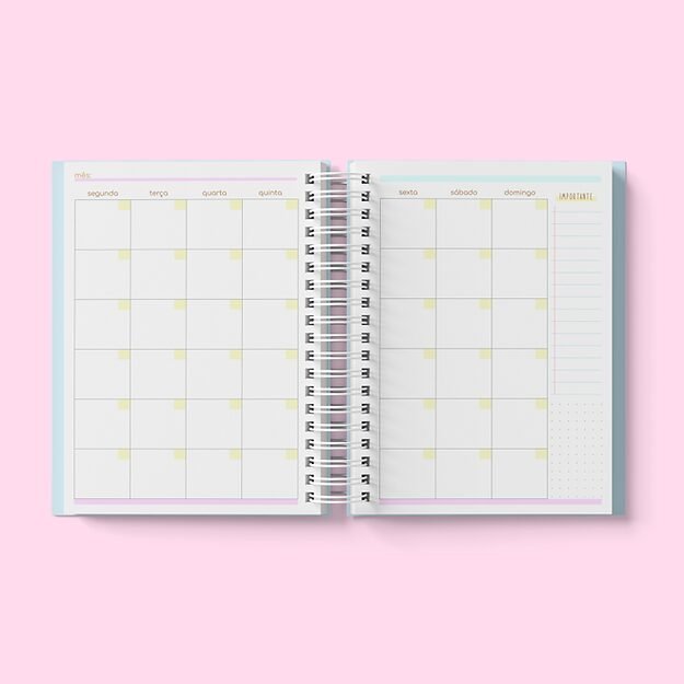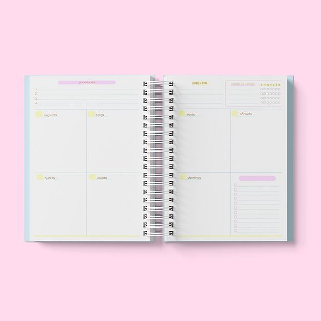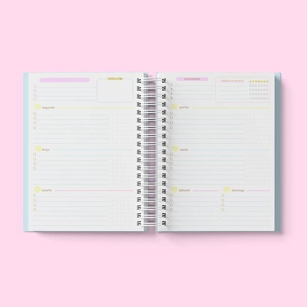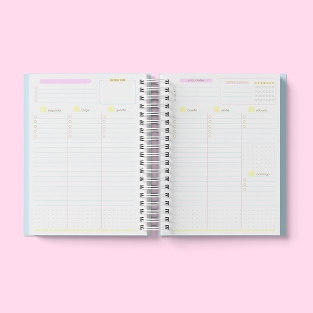 . Visão semanal em duas páginas de domingo a sábado, com local para anotar ou colar os dias,