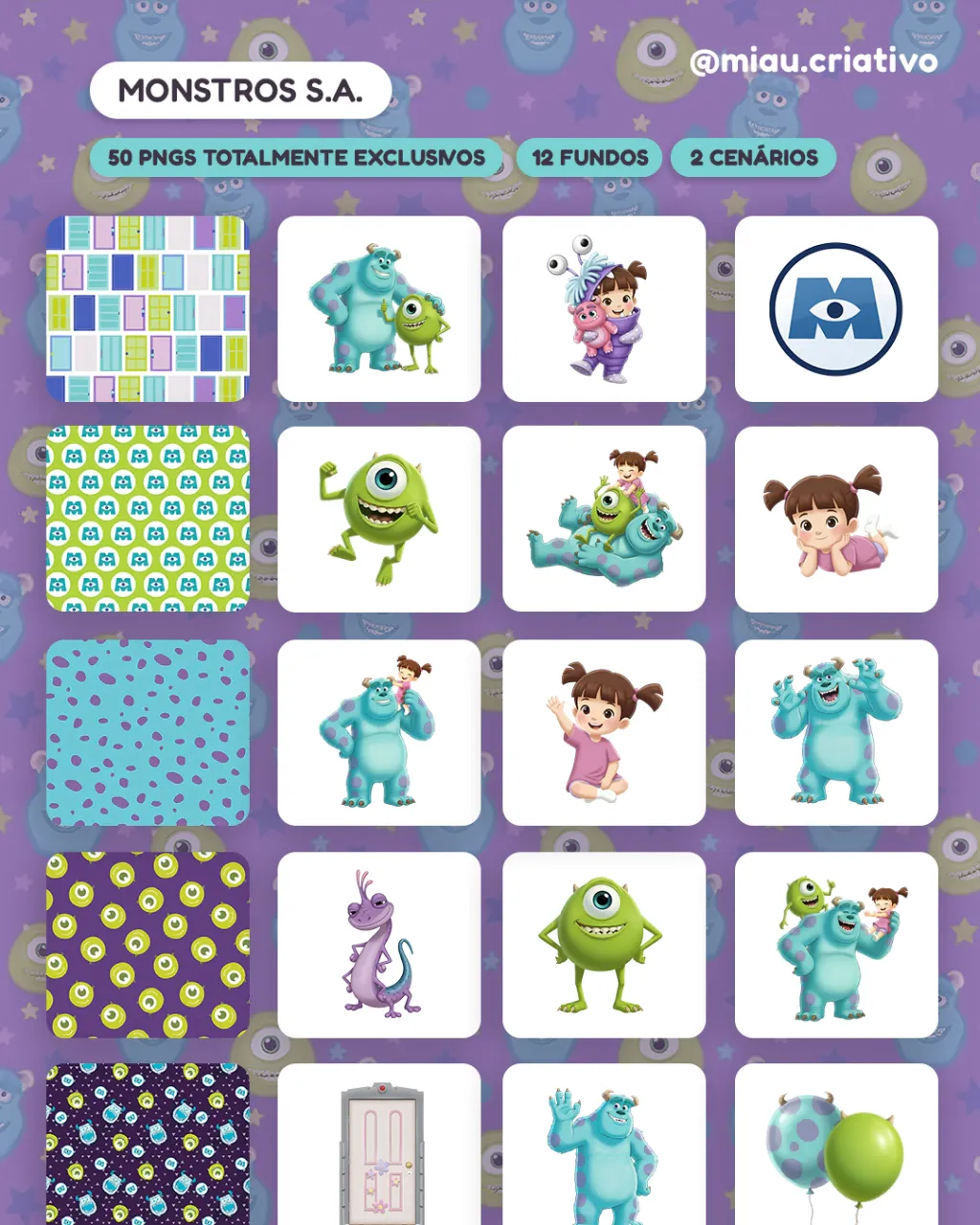 ✨ O Kit Digital “Monstros S.A.” inclui 50 imagens totalmente exclusivas em PNG dos personagens e elementos do filme. Também inclui 12 fundos e 2 cenários prontos. É ideal para criação de convites, kits de lembrancinhas e outros materiais diversos. Use sua criatividade!