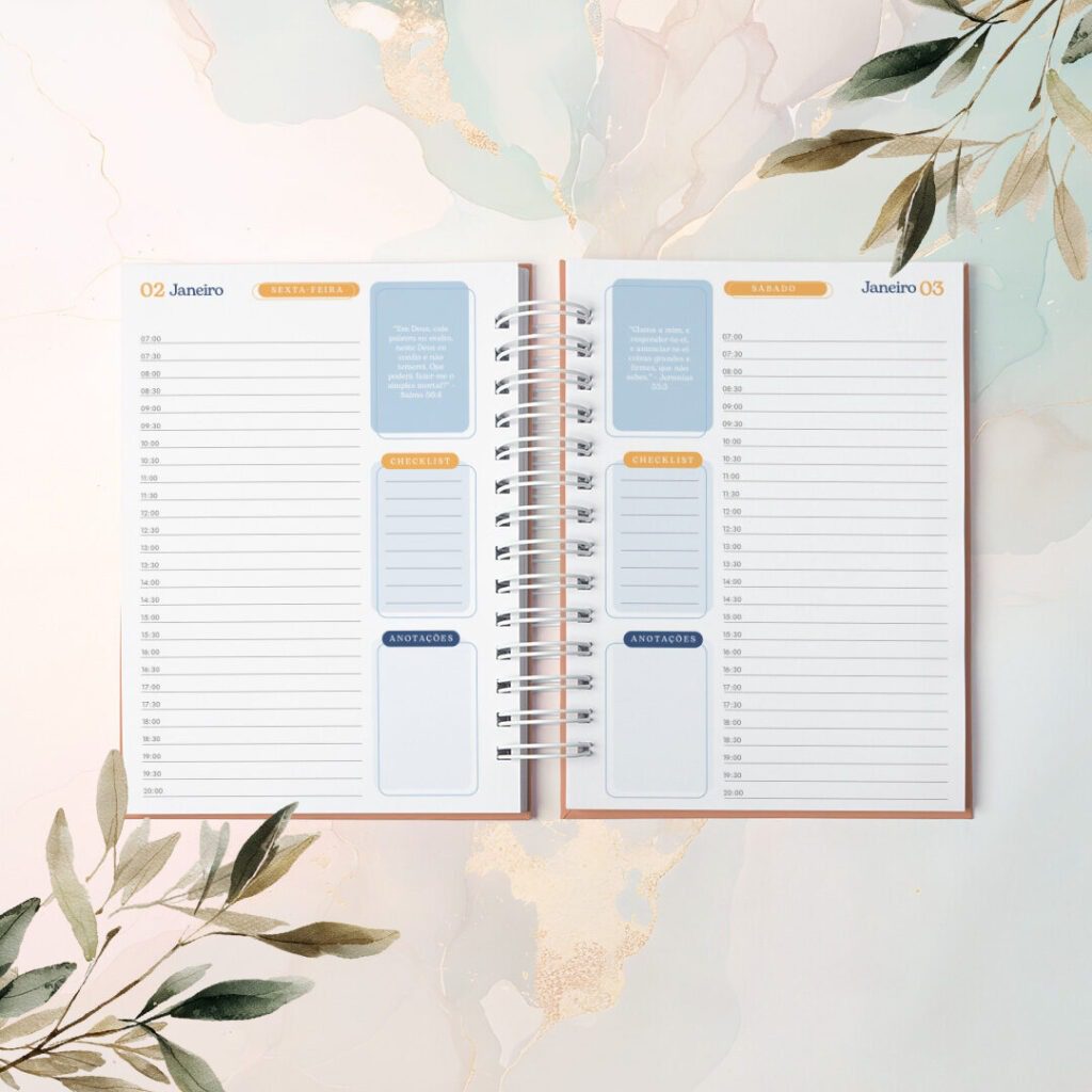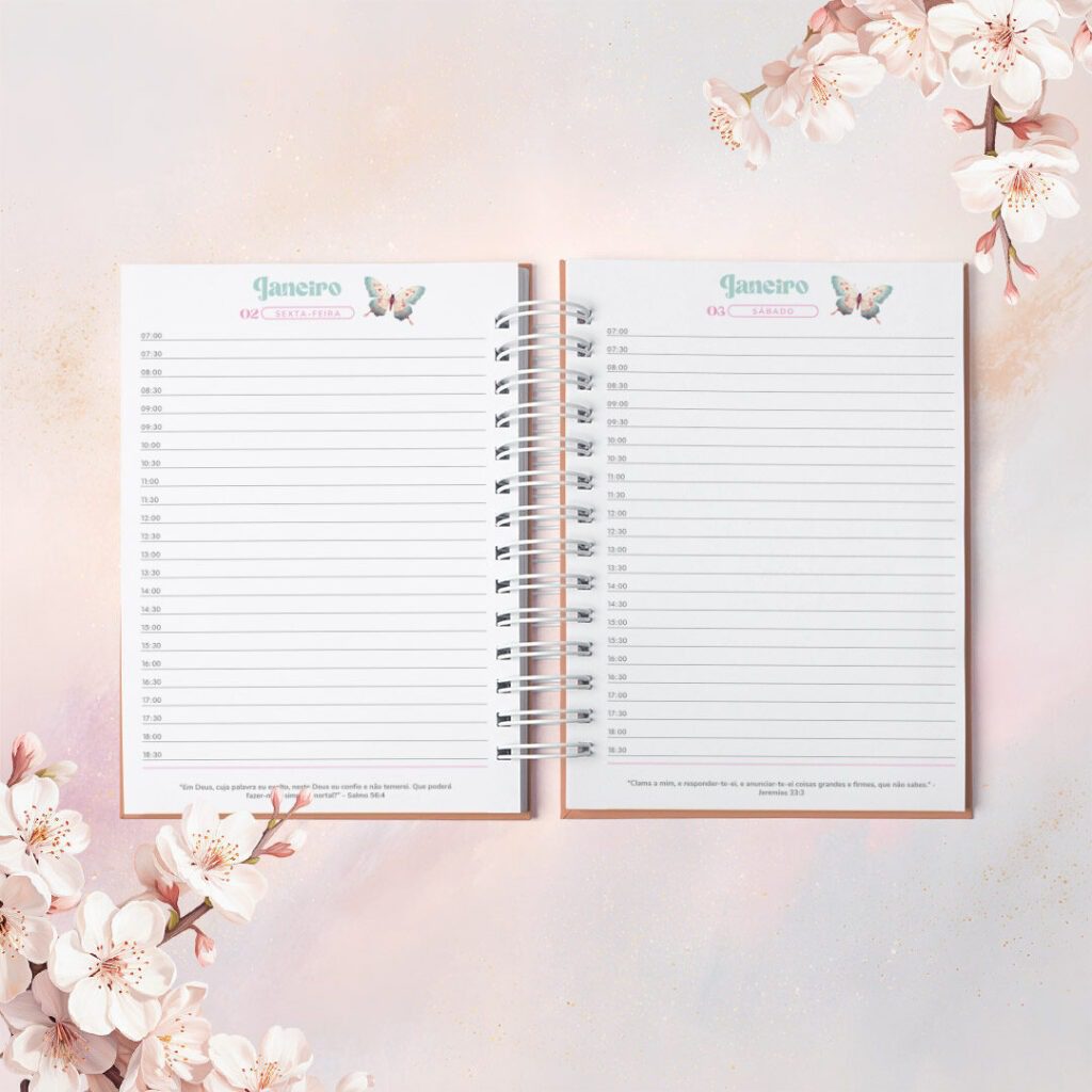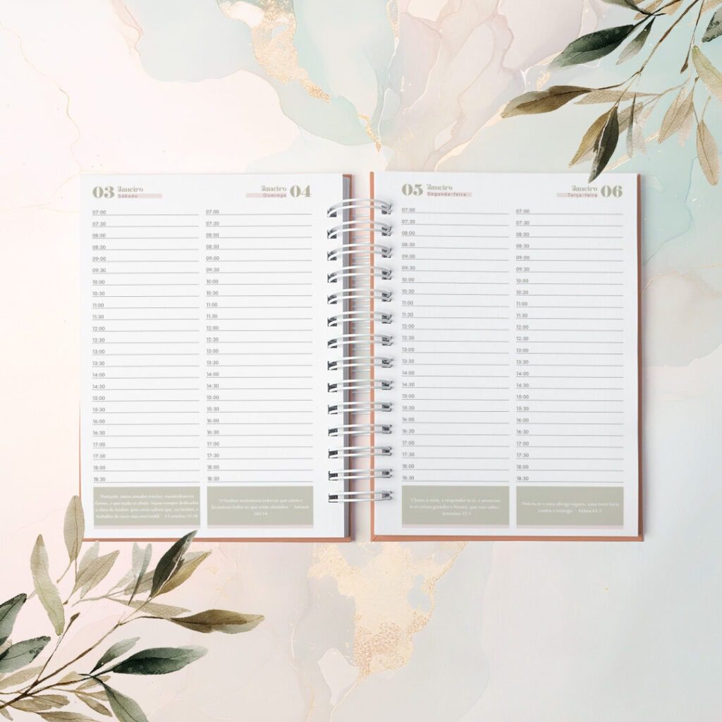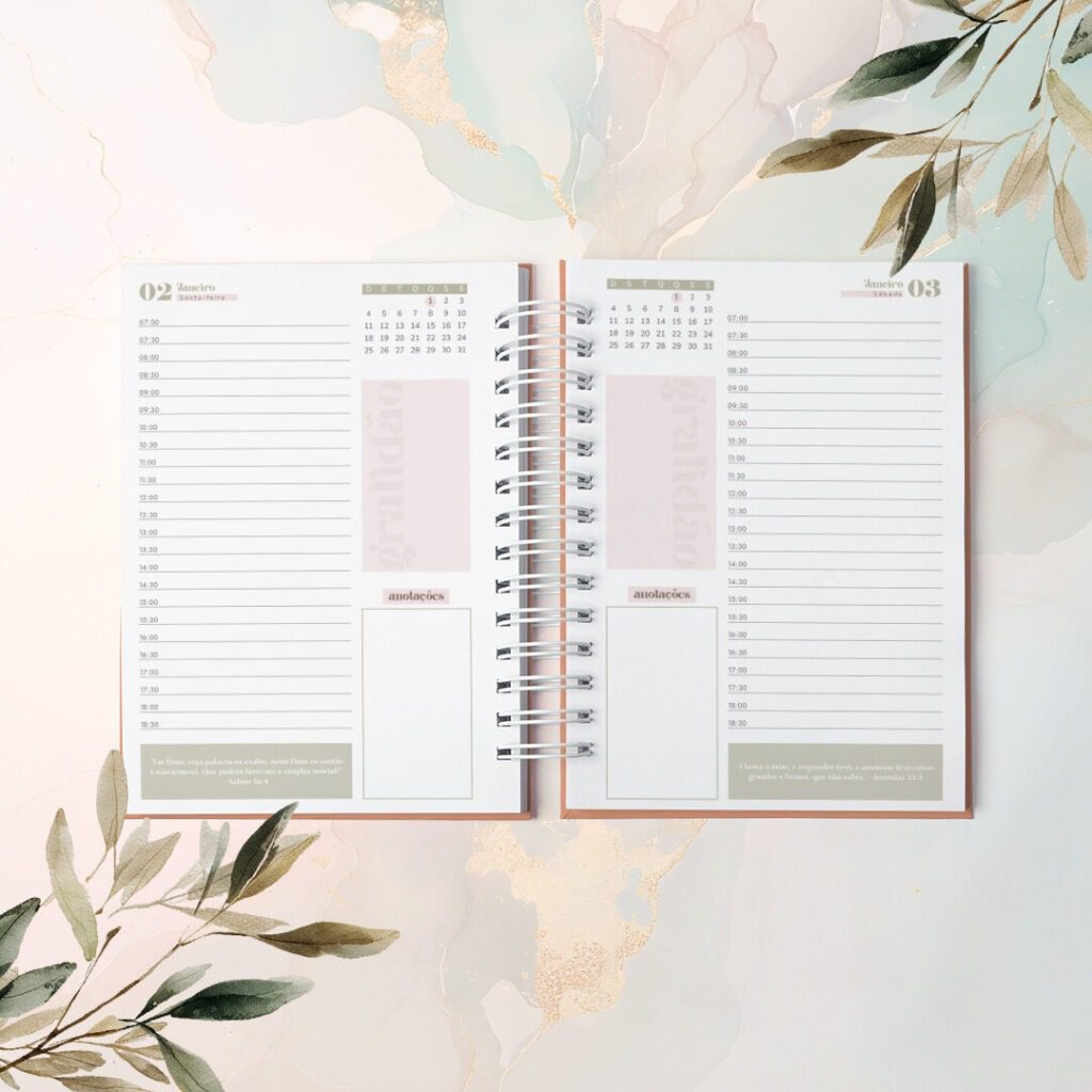 As Agendas com Versículos 2026 foram criadas para quem vê a organização como algo além de prazos e listas. Com um versículo bíblico diferente em cada página, elas irão acompanhar o dia com leveza, como presença diária de inspiração e fé no meio da rotina.