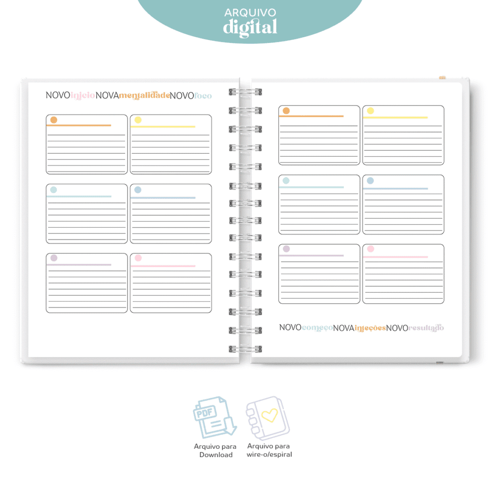 - Visão semanal em duas páginas de segunda a domingo, com os dias do mês.