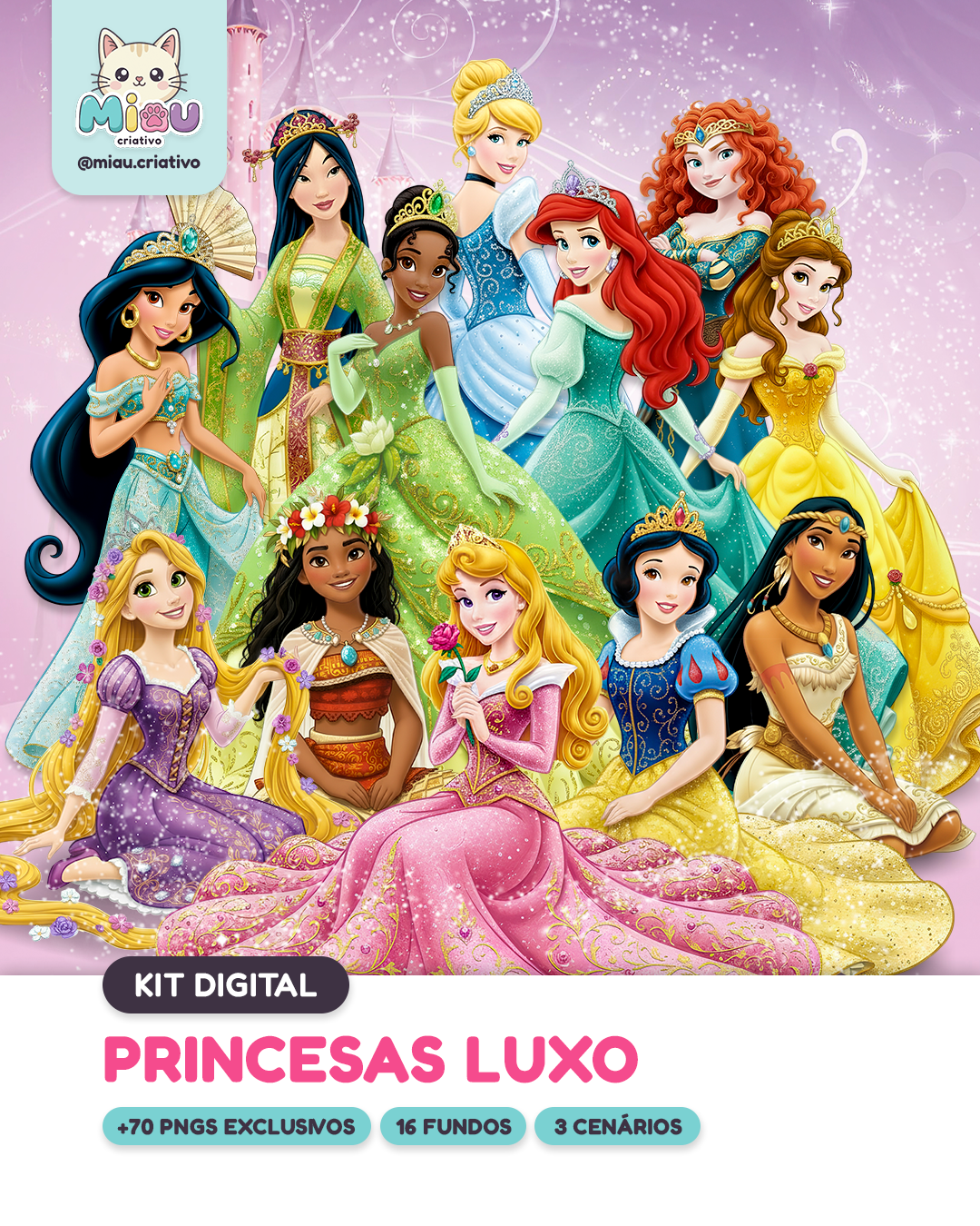 ✨ O Kit Digital “Princesas Luxo” inclui +70 imagens totalmente exclusivas em PNG das Princesas Disney com muito, brilhos e detalhes luxuosos: Branca de Neve, Cinderela, Aurora, Ariel, Bela, Jasmine, Pocahontas, Mulan, Tiana, Rapunzel, Merida e Moana, além de elementos que representam cada princesa. Também inclui 16 fundos e 3 cenários prontos. É ideal para criação de convites, kits de lembrancinhas e outros materiais diversos. Use sua criatividade!