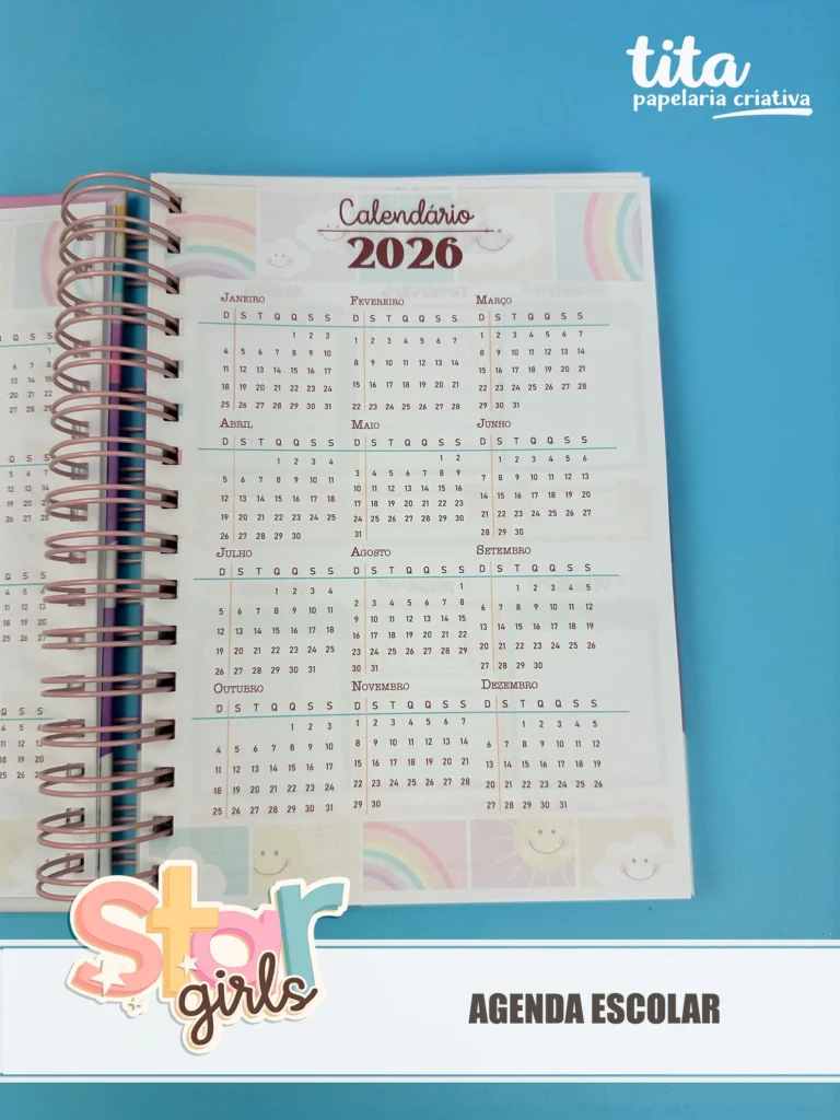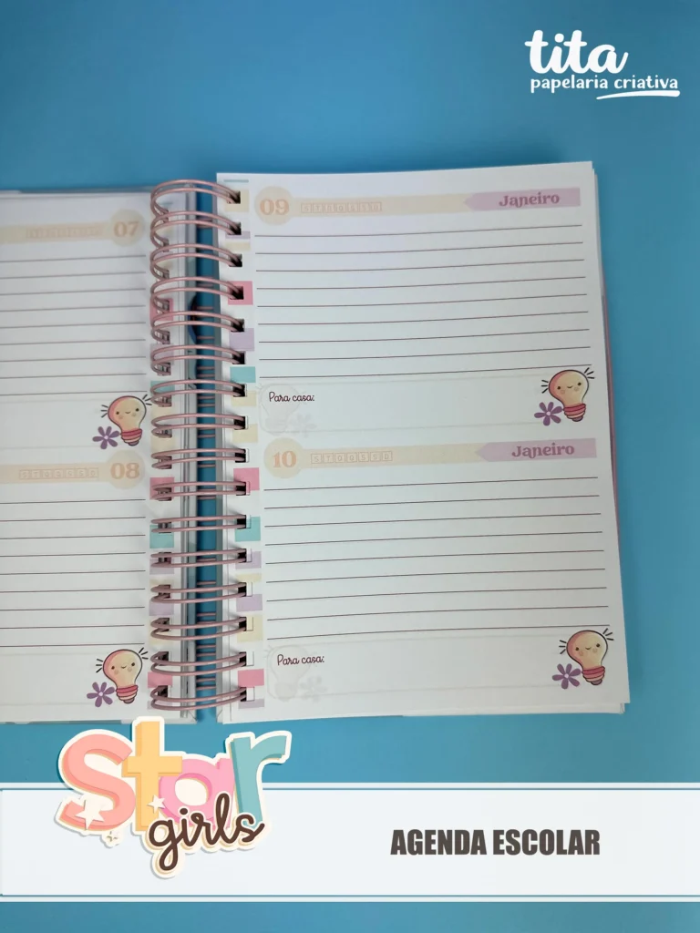 • Agenda Escolar A5 – Miolo personalizado, bolsinhos, 2 cartelas de adesivos  e várias capas. >>Miolo com e sem divisão de meses (com dias da semana) e nas versões 1 dia e 2 dias por folha.